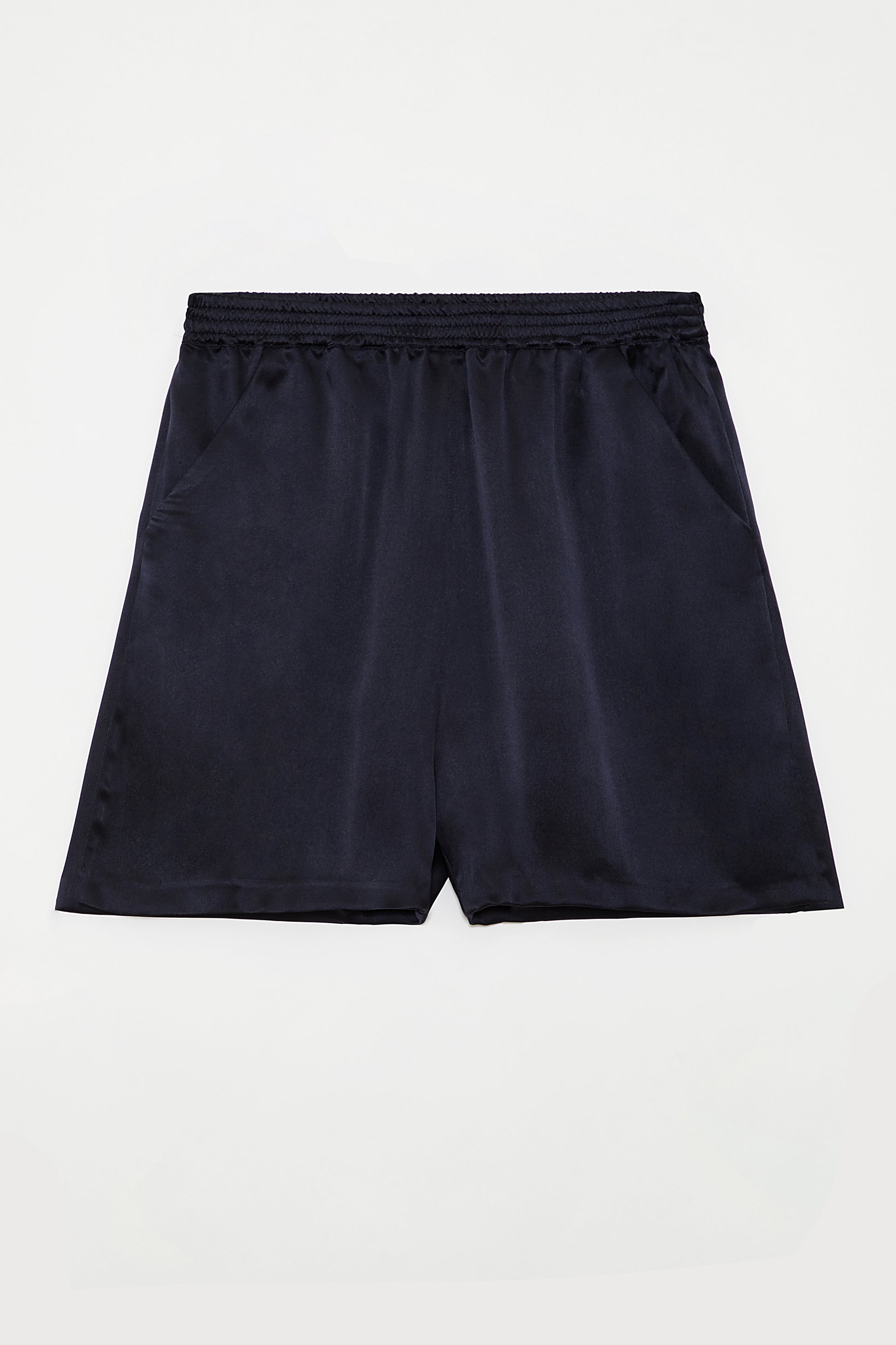 These shorts are the perfect styling piece for casual looks. They have a relaxed, fluid silhouette and an elastic waistband for a perfect fit.  The high-quality 100% silk charmeuse makes them a versatile piece to take you into the warm weather.