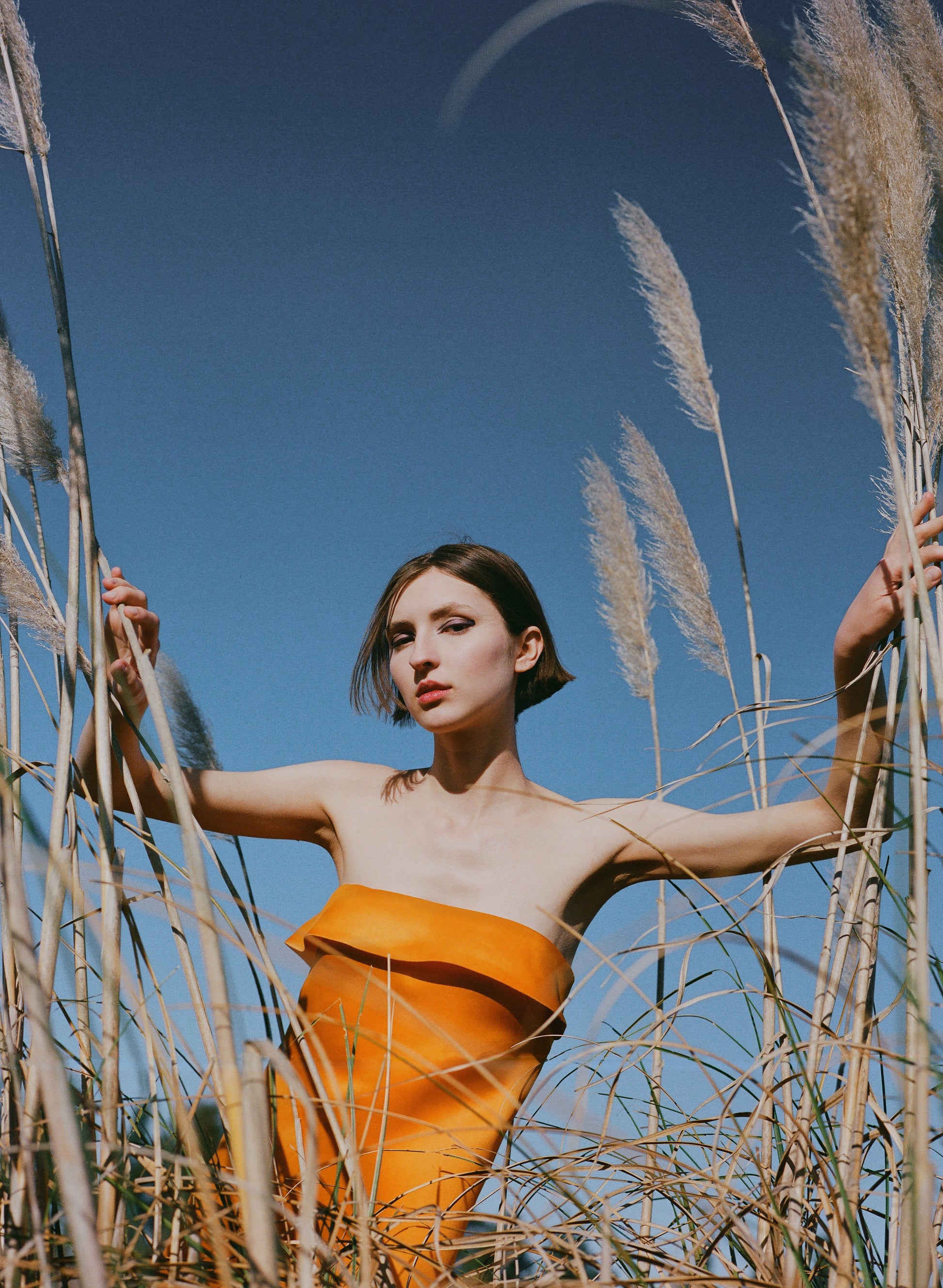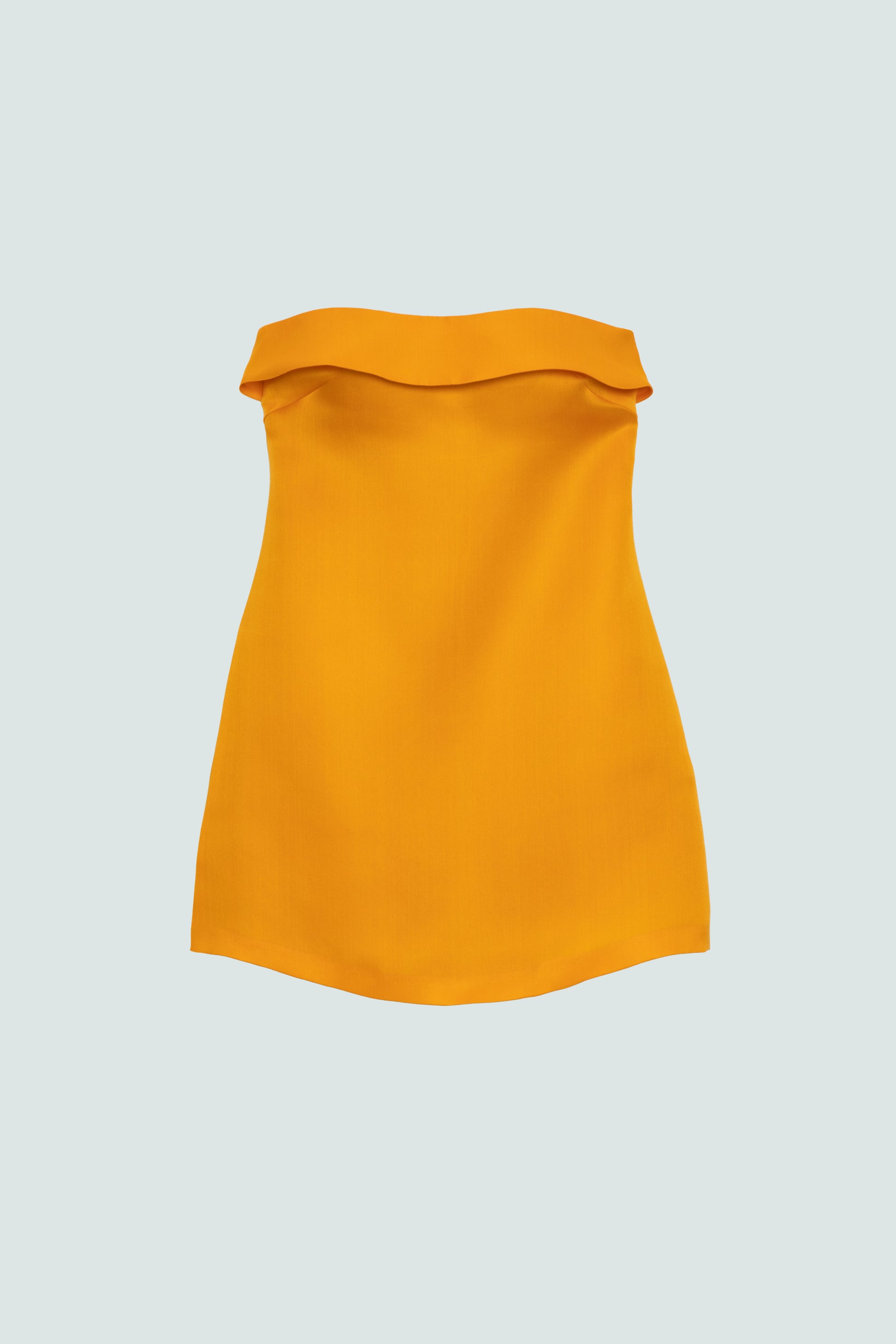 Strapless mini dress in silk gazar with front rufffle zipper back closure.