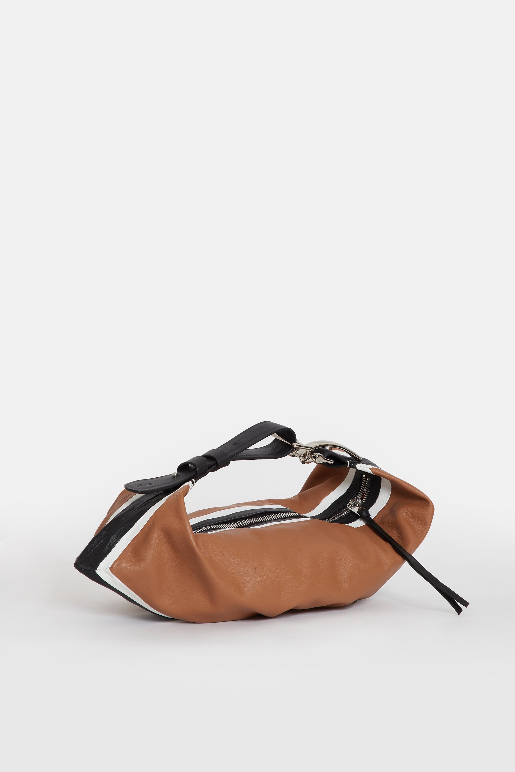 Our Minujín bag, entirely finished by hand with nickel-plated solid brass hardware, is a new approach to design that turns the fashion world on its head. Its original silhouette is ideal for storing essentials while on the go.