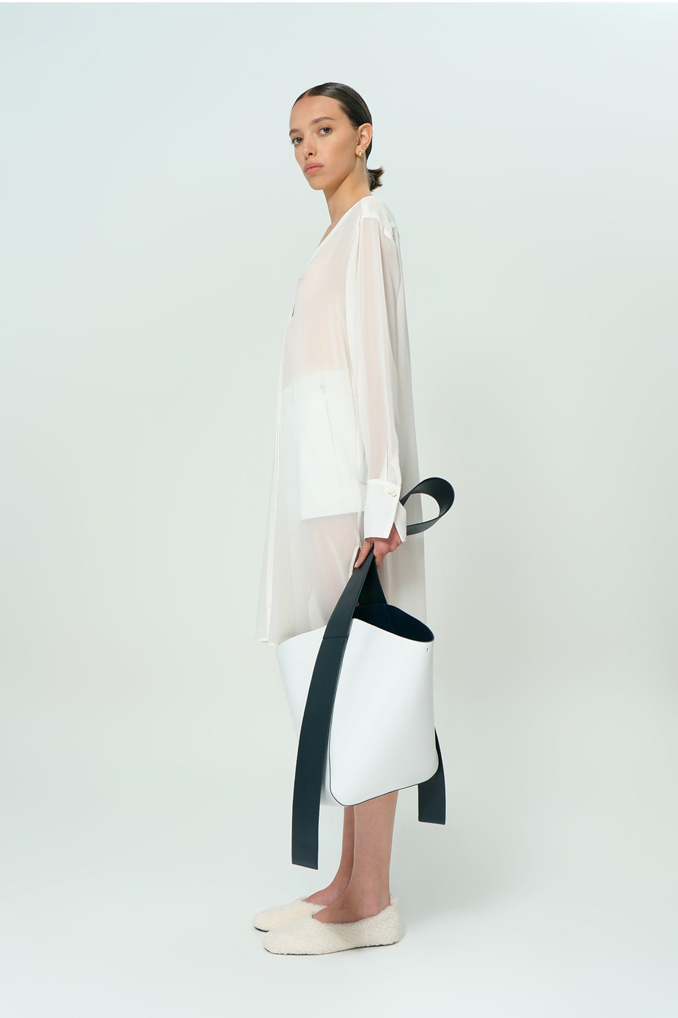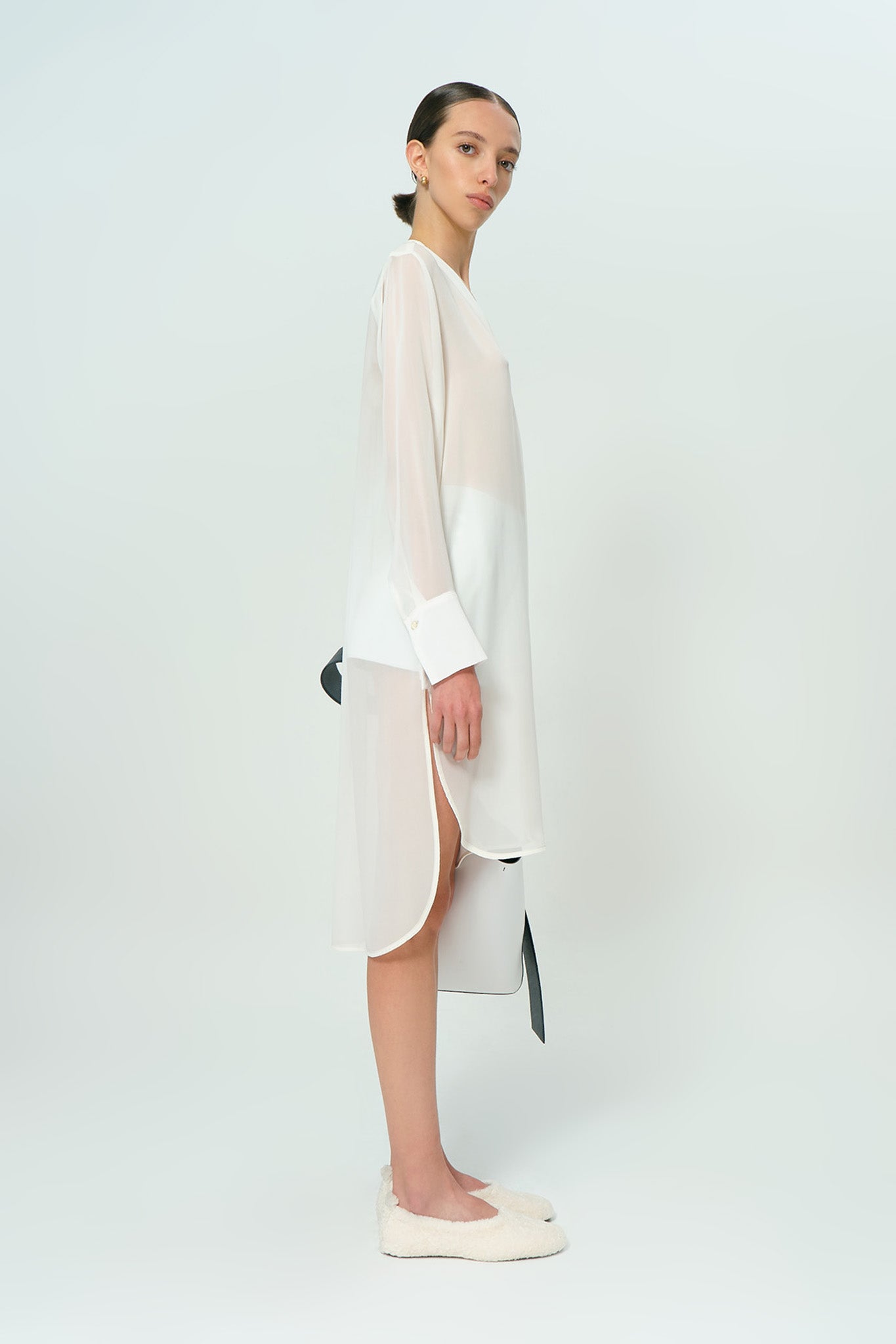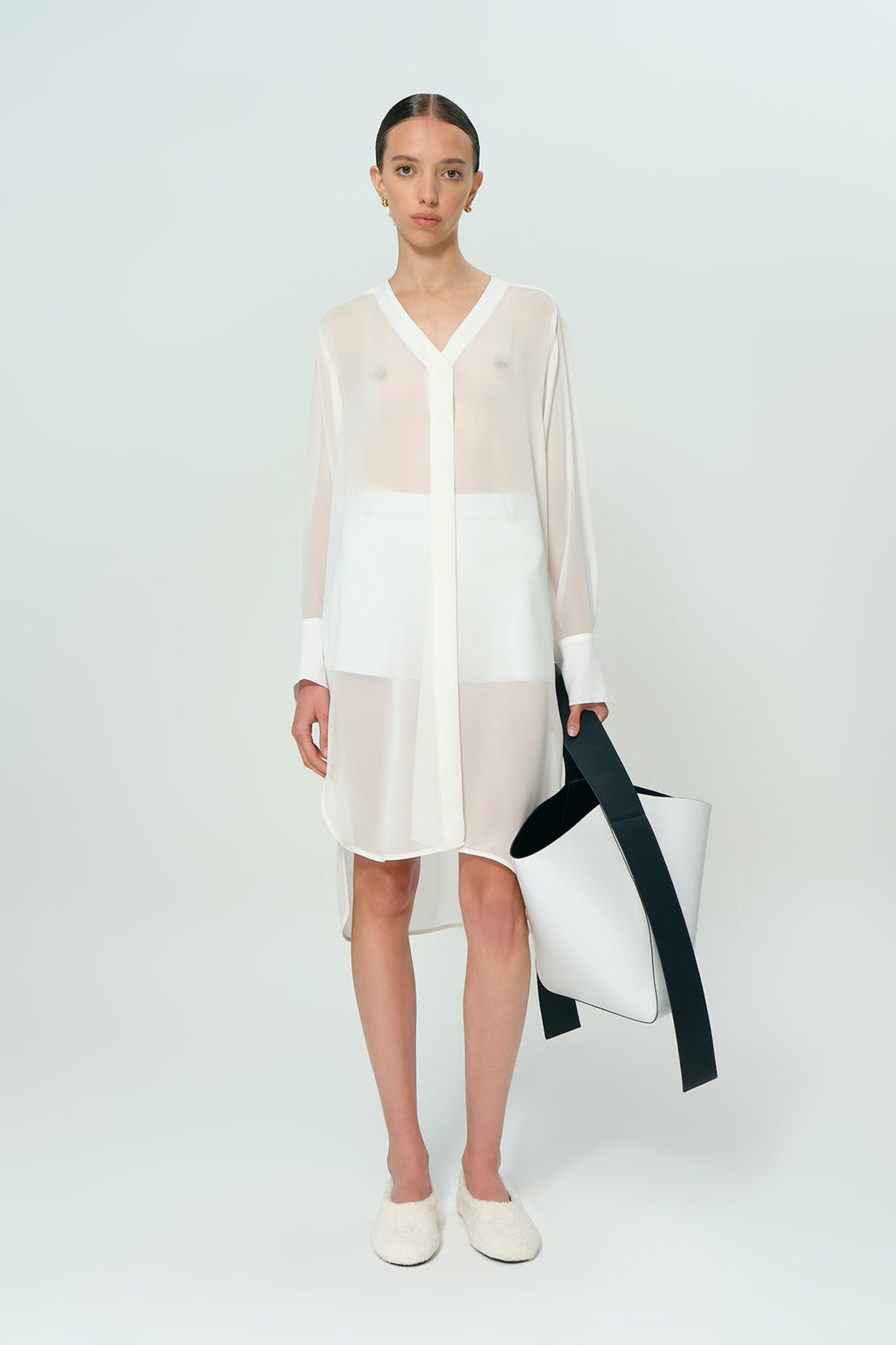 This shirt is one of our best-sellers! It is an extra-long shirt for both day and night, made of 100% silk georgette. It has a bohemian vibe and fine details in the V-neck and cuffs that add a feminine touch to your look.