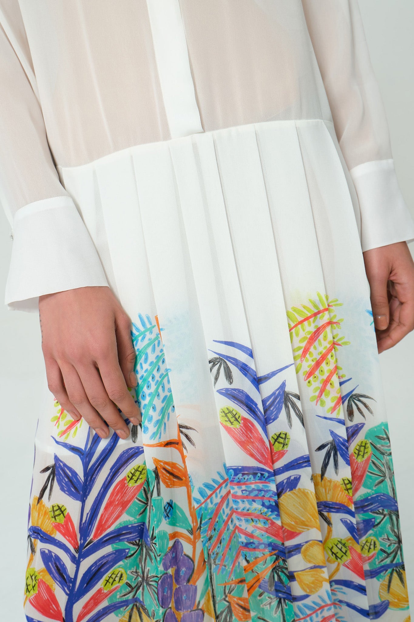 This lovely shirt-type dress, made of 100% silk georgette, is made for you to swish about your day. It is neatly pleated so it will flow elegantly with every move.
