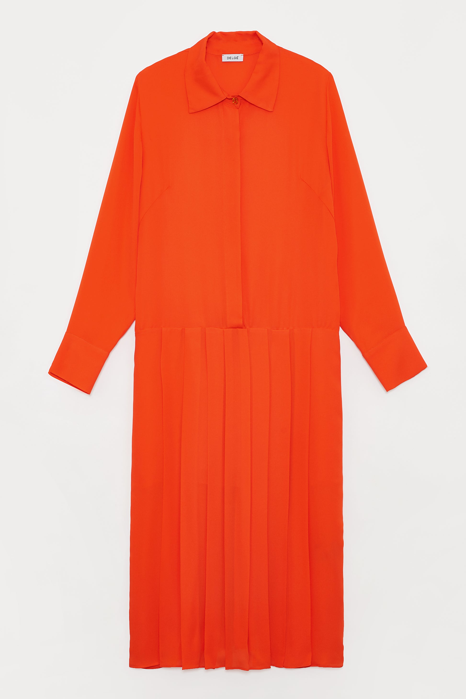 This lovely shirt-type dress, made of 100% silk georgette, is made for you to swish about your day. It is neatly pleated so it will flow elegantly with every move.